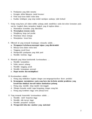 1.dibawah ini yang bukan ciri dari kerja keras adalah …. Kewirausahaan merupakan salah satu materi pada mata pelajaran ekonomi yang bisa anda temukan di jenjang smp, sma dan smk, seperti kelas 11 atau xi, 12 dan lainnya. Latihan soal kewirausahaan kelas 10 sma/ma draft. 1 komentar untuk contoh soal prakarya kelas 12 dan jawabannya balas. Adapun soal tersebut bisa anda lihat di bawah ini.